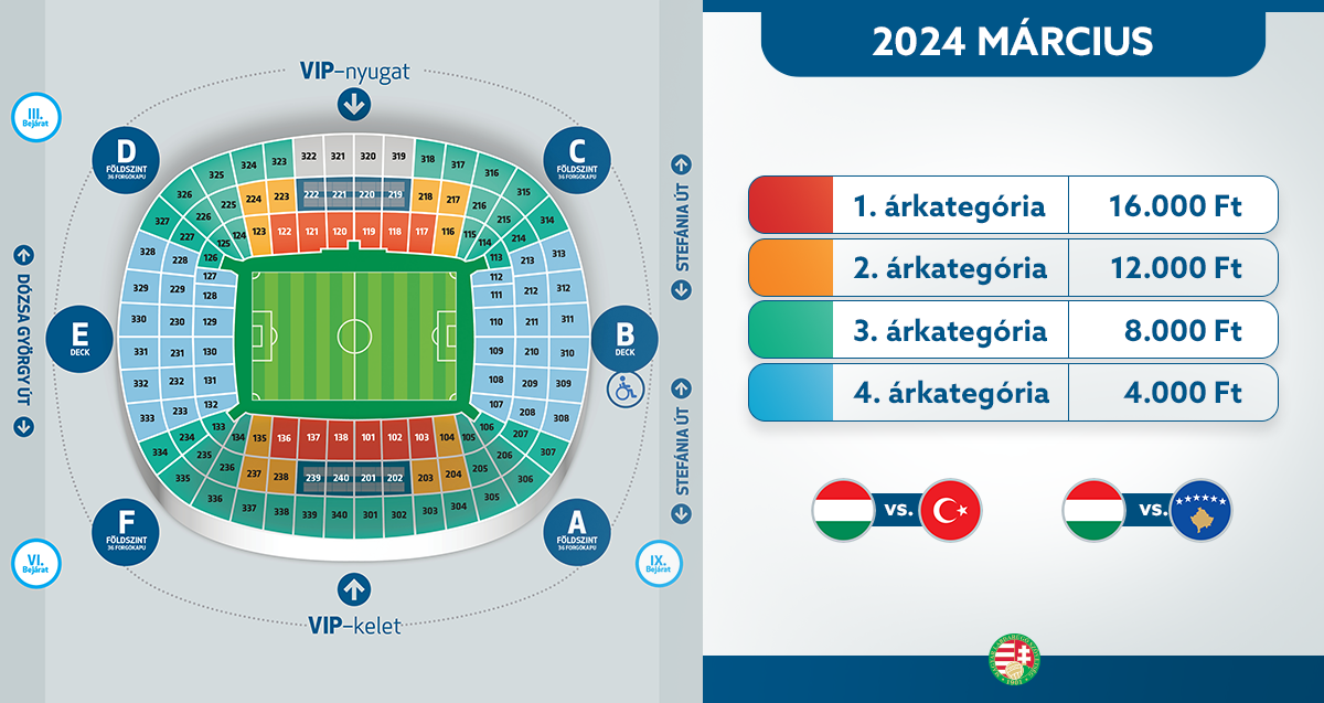 A 2024-es bérlet árusítása március 1-jén 10 órakor kezdődik a meccsjegy.mlsz.hu oldalon, első körben a megújult Szurkolói Klub tagjai vásárolhatják meg az öt hazai mérkőzés belépőjét tartalmazó bérletet. Az SZK-tagsággal nem rendelkező szurkolók számára (regisztrációt követően) március 4-én 10.00 órától nyílik lehetőség a vásárlásra, amennyiben még maradnak értékesíthető bérletek.